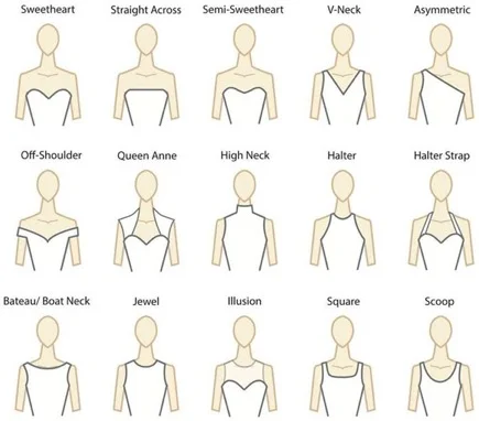 A dress’s neckline can determine what jewelry to wear. Here are some general guidelines but by no means are they hard and fast rules. A helpful way to test different jewelry is by trying it on with a top that has your dress’s neckline.