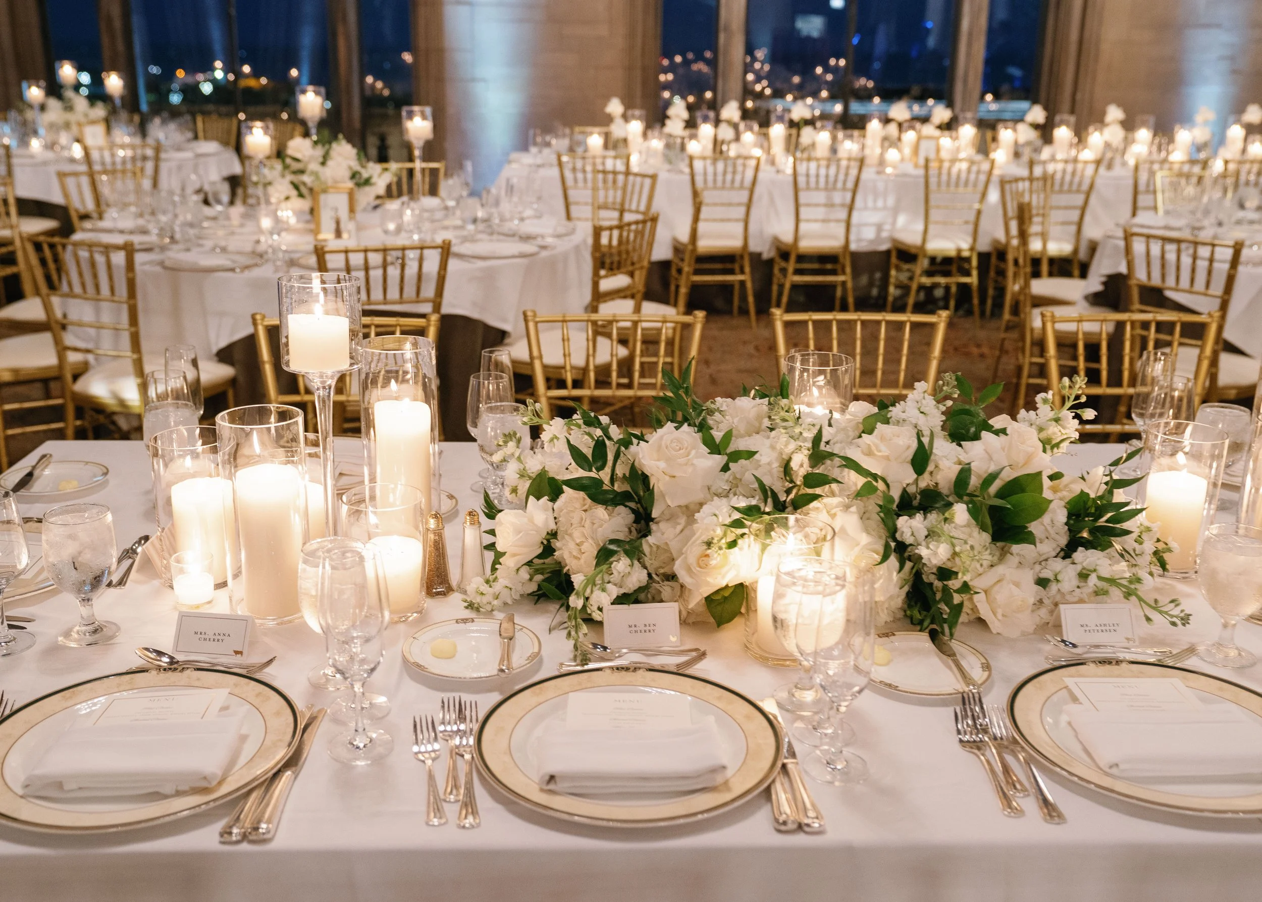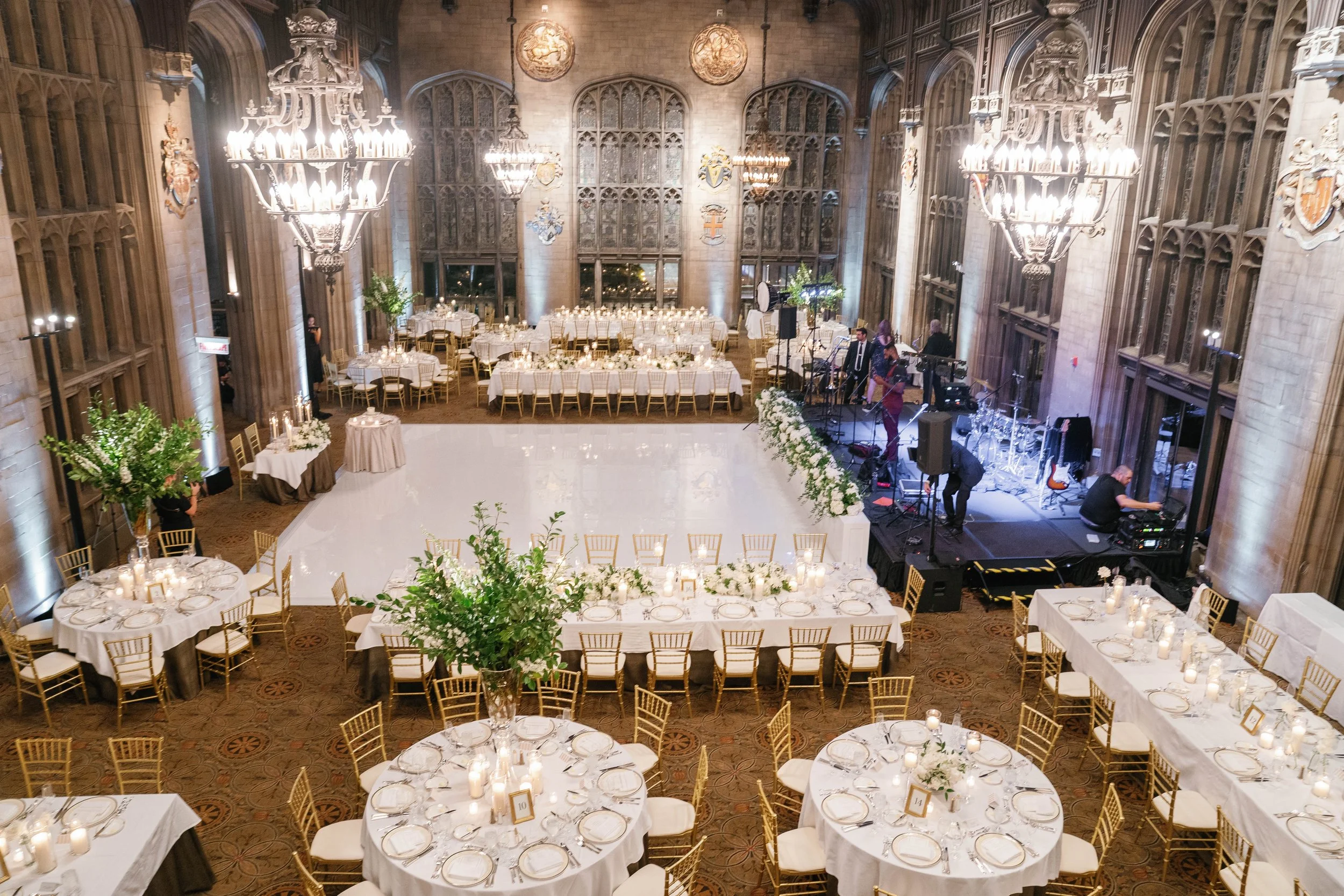 The reception took place in the breathtaking Cathedral Hall, where long candlelit tables and gold chiavari chairsglowed under the warm light of the chandeliers. A lush floral design of white blooms and fresh greenery brought a touch of natural romance to the formal architecture. The polished white dance floor reflected the candlelight, creating a dreamy backdrop for the couple’s first dance and an evening filled with laughter, music, and joy.