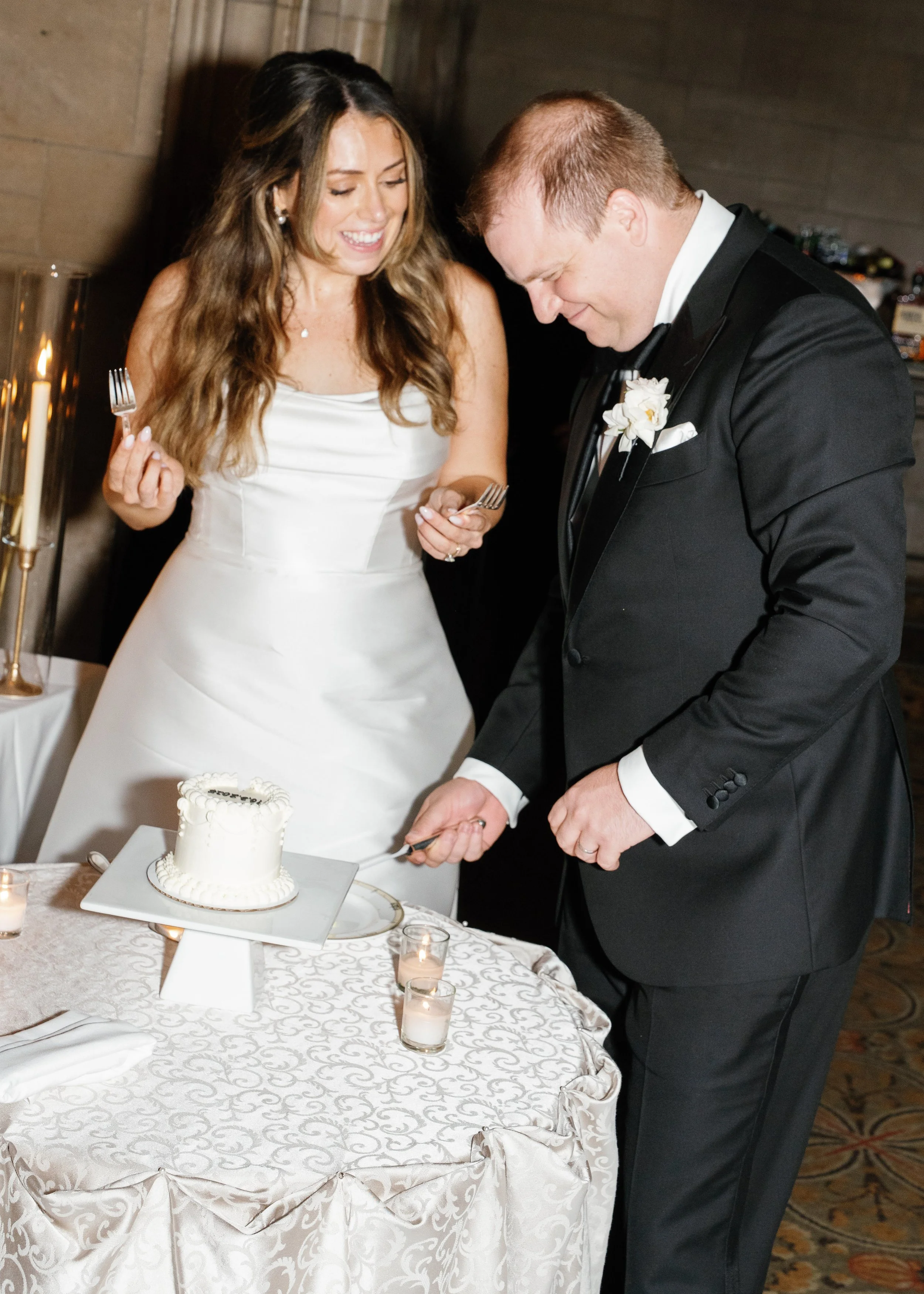 From the soft flicker of candles to the grandeur of the hall’s gothic details, every element of Anne and Baxter’s wedding radiated refined sophistication and old-world Chicago charm. Guests dined beneath towering ceilings and intricate stonework, surrounded by the gentle sounds of a live band and the joyful energy of celebration.